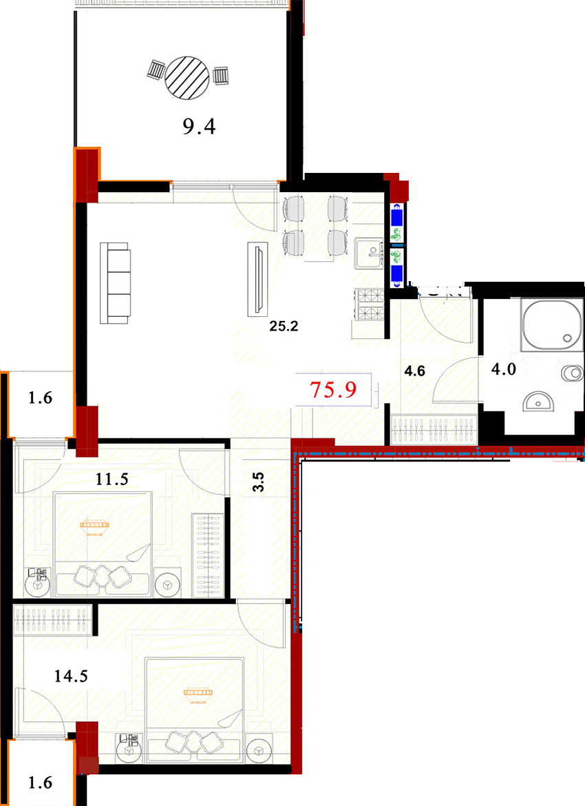 საერთო ფართი.: 75.9 m²